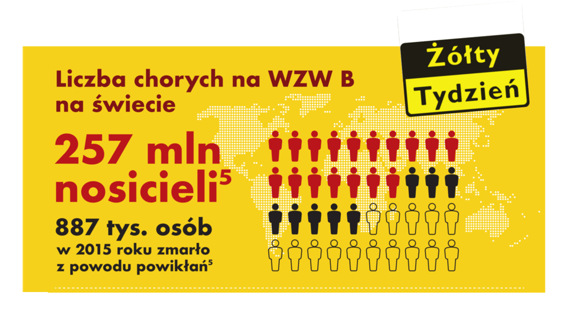 Najczęstszą wirusową chorobą wątroby jest wirusowe zapalenie wątroby typu B, czyli tzw. „żółtaczka wszczepienna” lub „żółtaczka zakaźna typu B”. Wywołuje ją wirus WZW typu B (HBV), który jest do 100 razy bardziej zakaźny niż wirus HIV4. Z wirusem WZW typu B mamy do czynienia częściej niż się nam może wydawać, ponieważ 1 na 100 zdrowych Polaków jest jego nosicielem5, a liczba zakażeń tym typem wirusa w Polsce należy do najwyższych w Europie. W 2015 r. odnotowano znaczny wzrost zakażeń WZW typu B. Według danych PZH, w okresie od stycznia do sierpnia 2015 r. zaobserwowano około 900 więcej nowych przypadków zakażeń WZW typu B niż w analogicznym okresie poprzedniego roku.