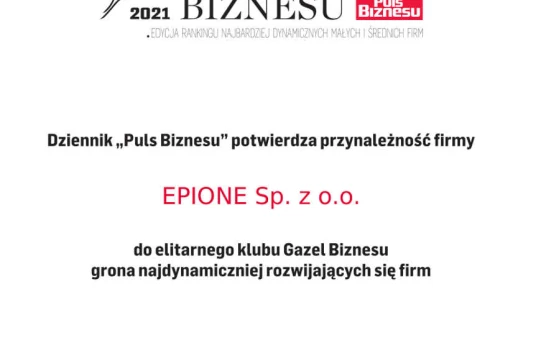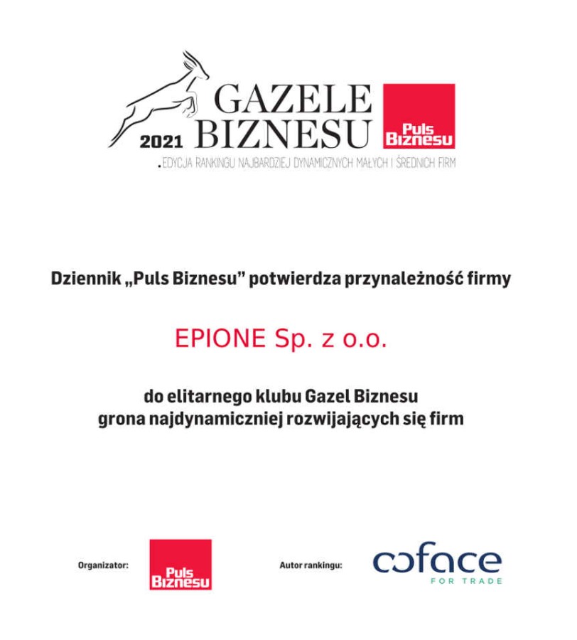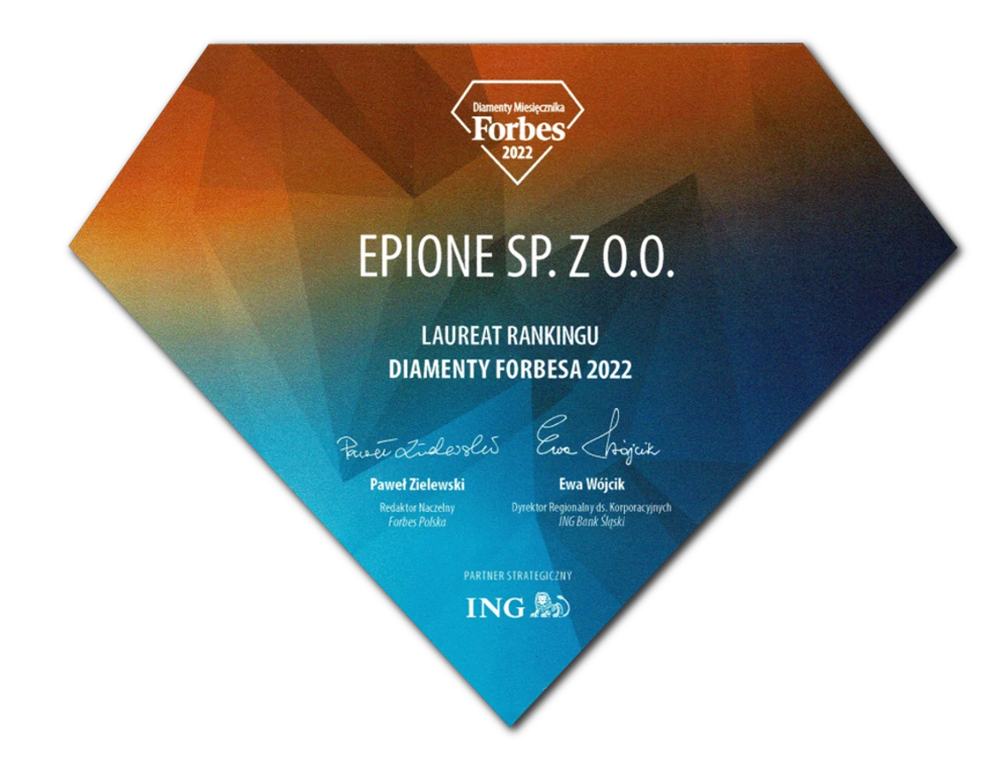 Wysoka pozycja w rankingu Diamentów miesięcznika „Forbes” jest kolejnym wyróżnieniem dla spółki EPIONE po przynależności do grona Gazel Biznesu dziennika „Puls Biznesu”.