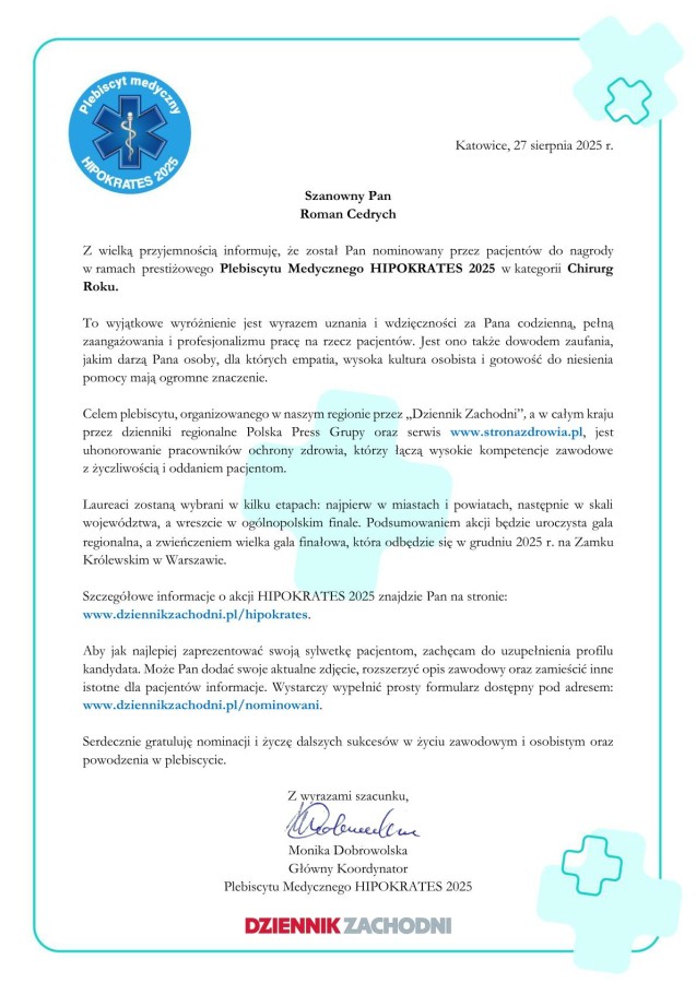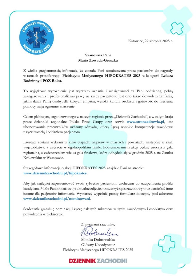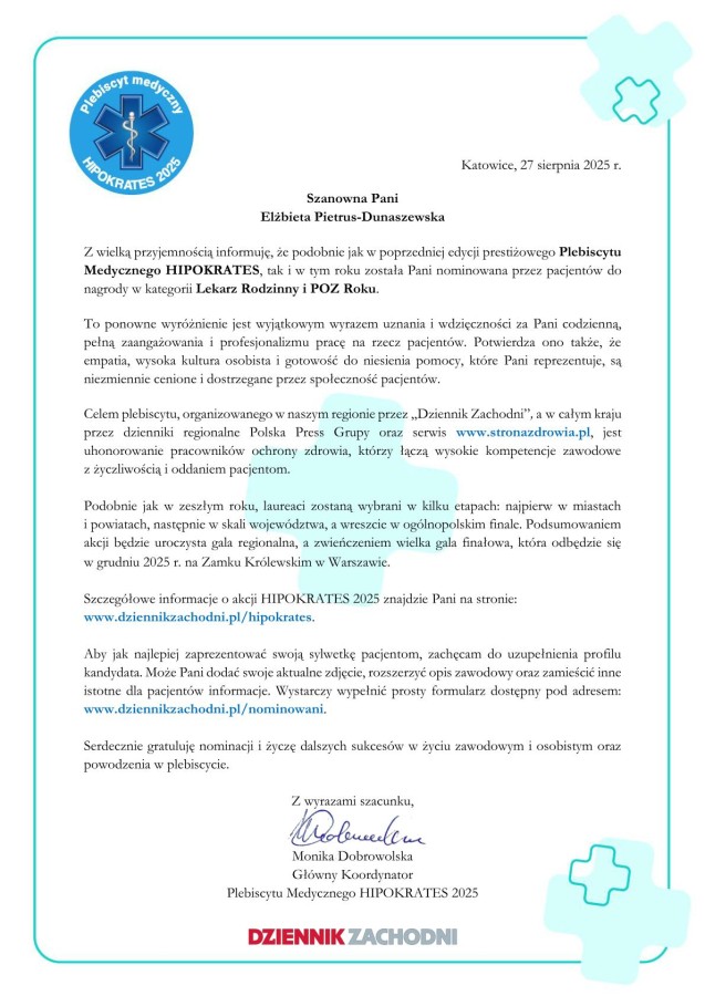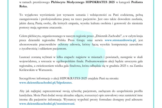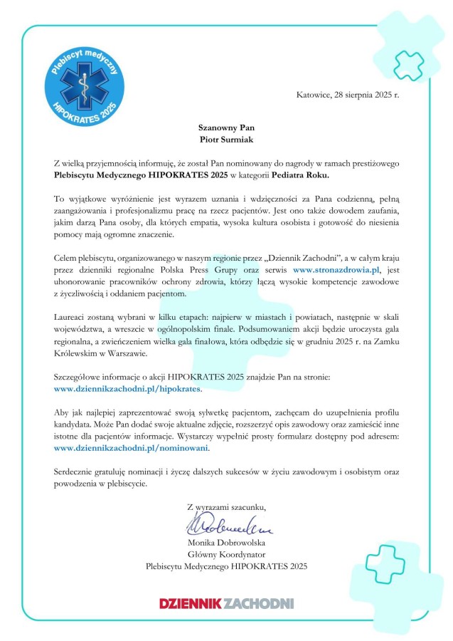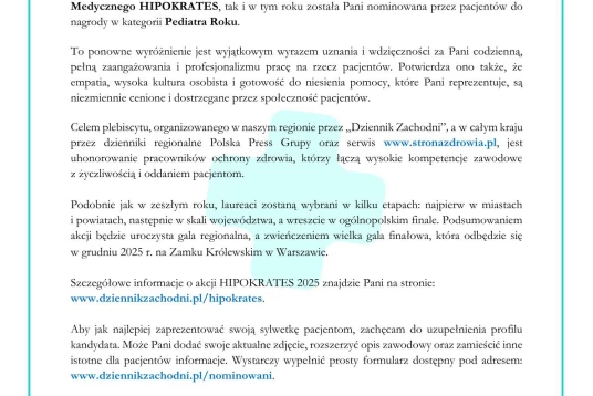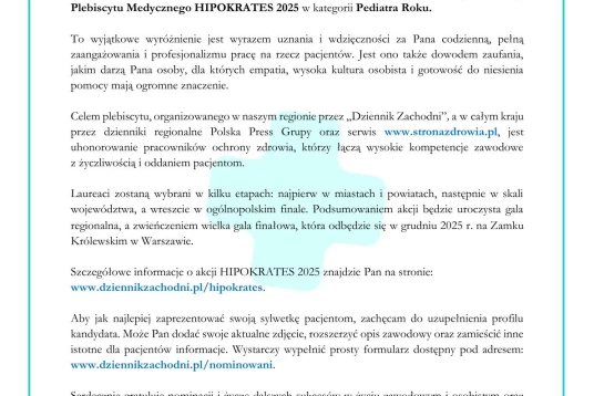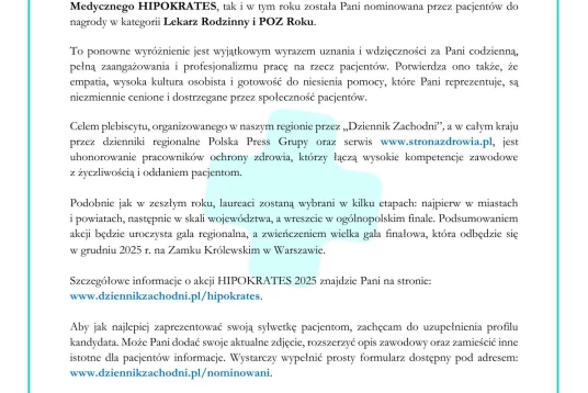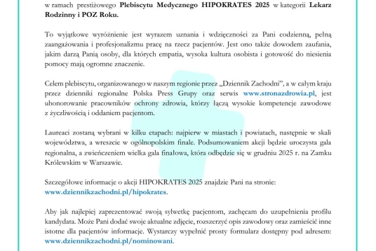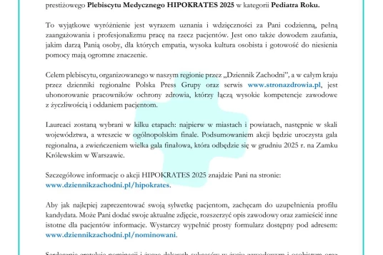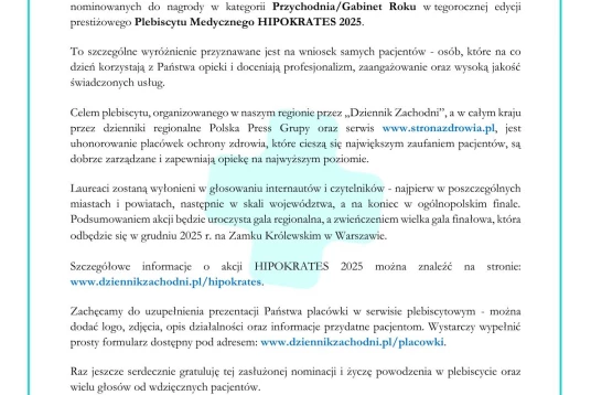 Z radością informujemy, że lekarze z naszych placówek zostali nominowani przez Państwa do prestiżowej nagrody w ramach Plebiscytu Medycznego HIPOKRATES 2025, organizowanego w naszym regionie przez Dziennik Zachodni.