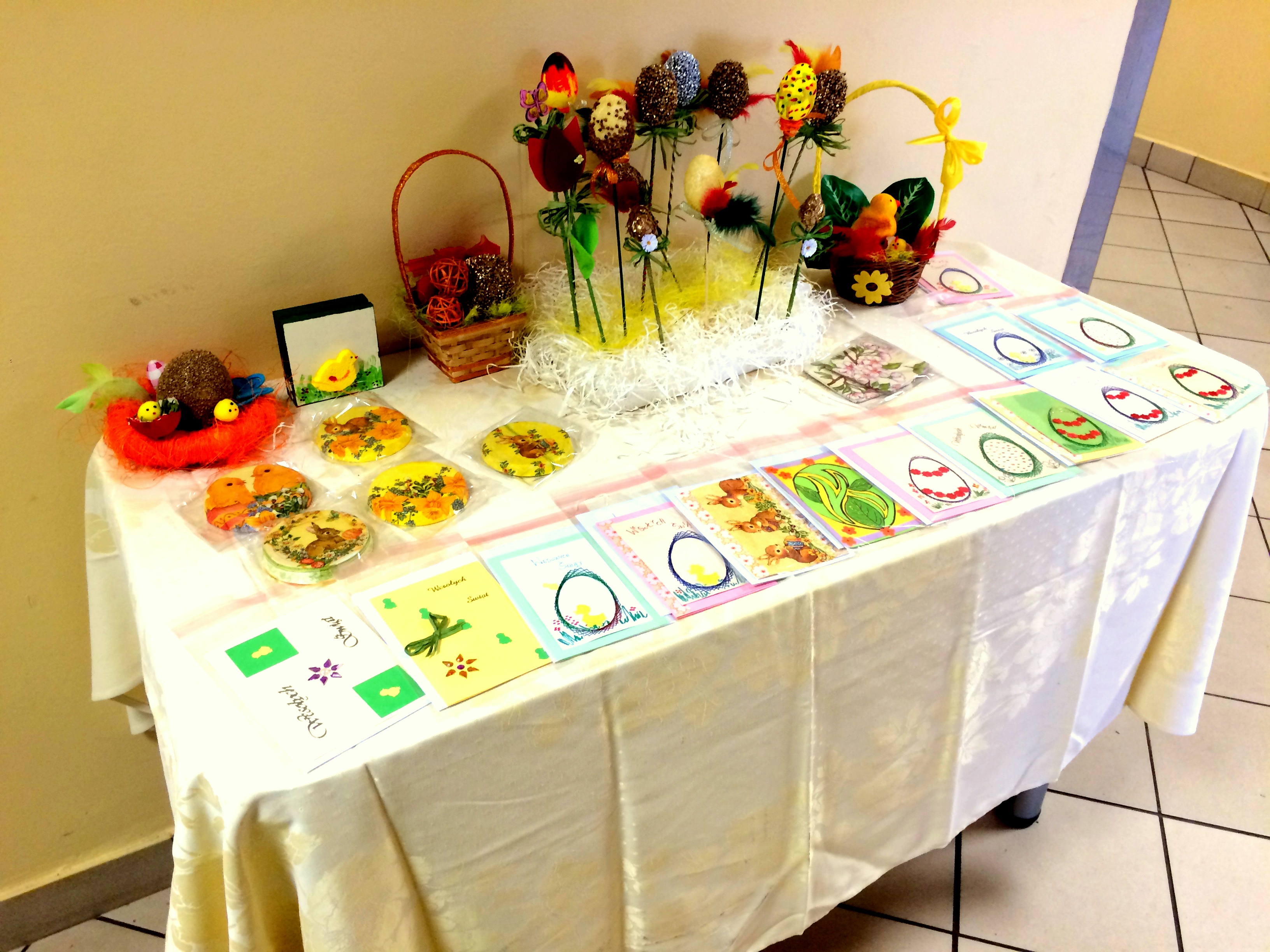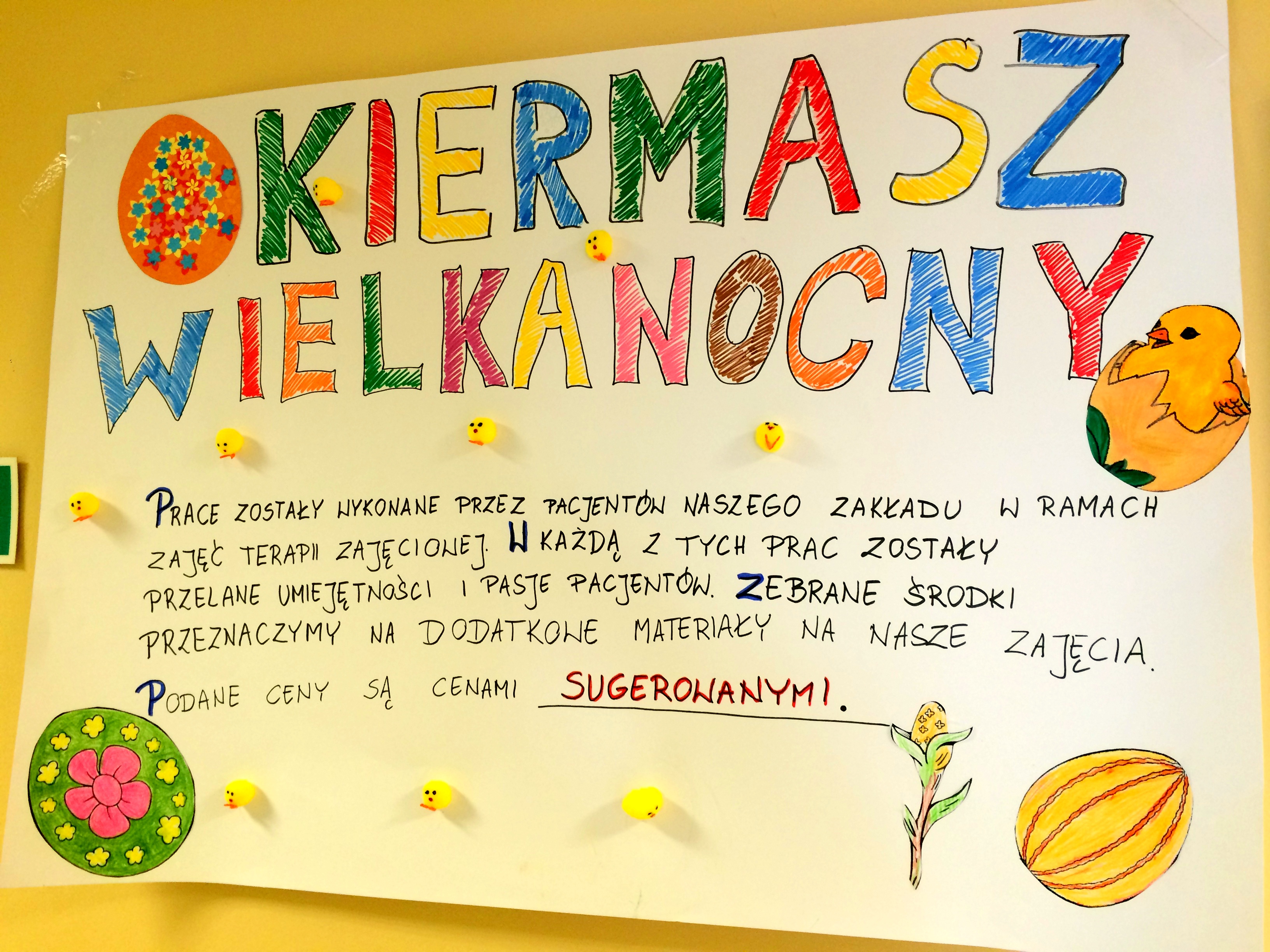 Z okazji Świąt Wielkanocnych zorganizowany został kiermasz prac wykonanych przez pacjentów naszej placówki w ramach zajęć terapii zajęciowej. Wszystkie z prac została wykonane dzięki umiejętnością i zaangażowaniu pacjentów. Zebrane środki zostały przeznaczone na dodatkowe materiały na zajęcia terapeutyczne z Pacjentów.